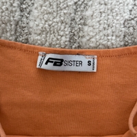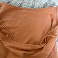Lyhyt toppi koossa s. Oikeaa väriä on vaikea saada kuviin. Toppi on hiukan vaaleampi oikeasti, sellainen aprikoosin/korallin värinen. Viat näkyvät kuvissa. Paidan sisäpuolella on kaksi tahraa, mutta ne ei näy ulkopuolelle. Olkaimia on vissiin joskus lyhennetty.