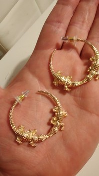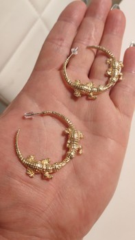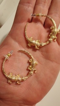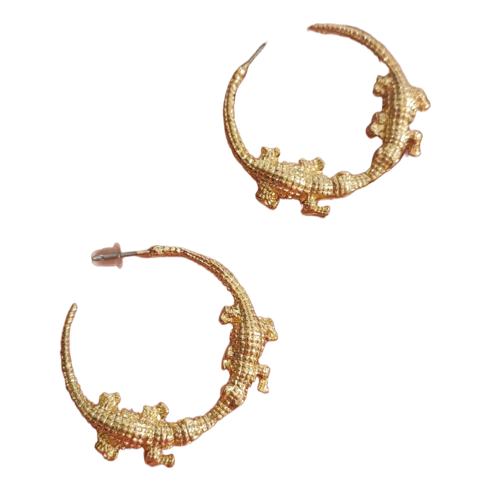 Kultaiset rengaskorvakorut, joissa on krokotiiliaiheinen yksityiskohta.