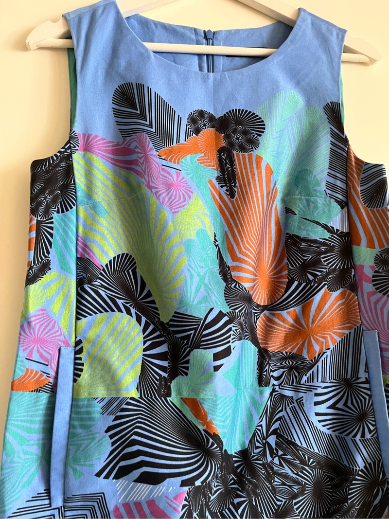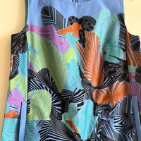 Marimekon hihaton Mahti-mekko. Kauniisti hohtavaa puuvillasatiinia, vuori ja taskut. Koko 34, kai-kai 42 cm. Hyvin pientä kulumaa kaula-aukossa.