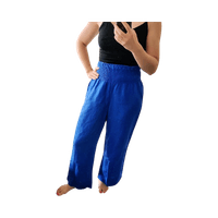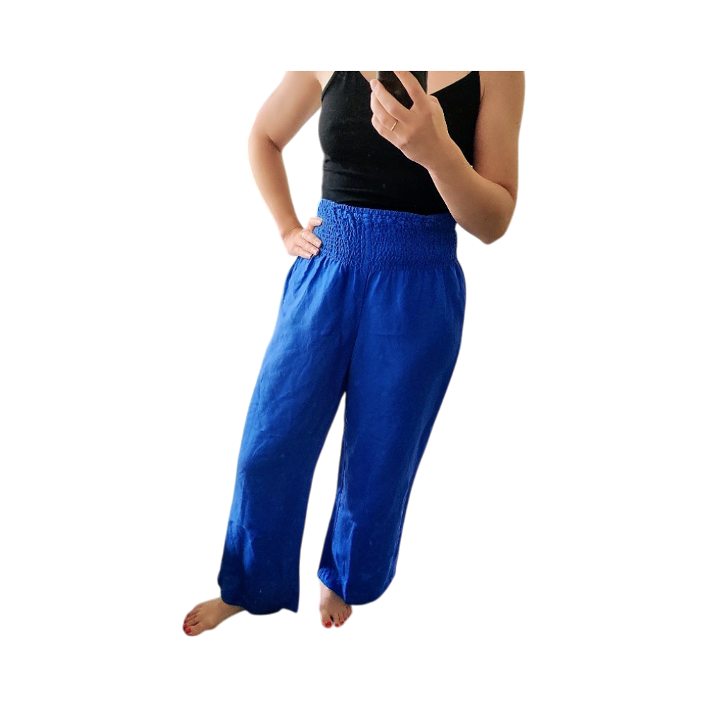 Mukavat siniset housut leveillä lahkeilla ja joustavalla vyötäröllä. Pellavaa 55%, viskoosia 45%