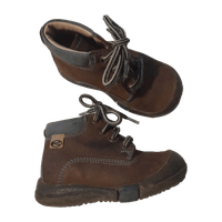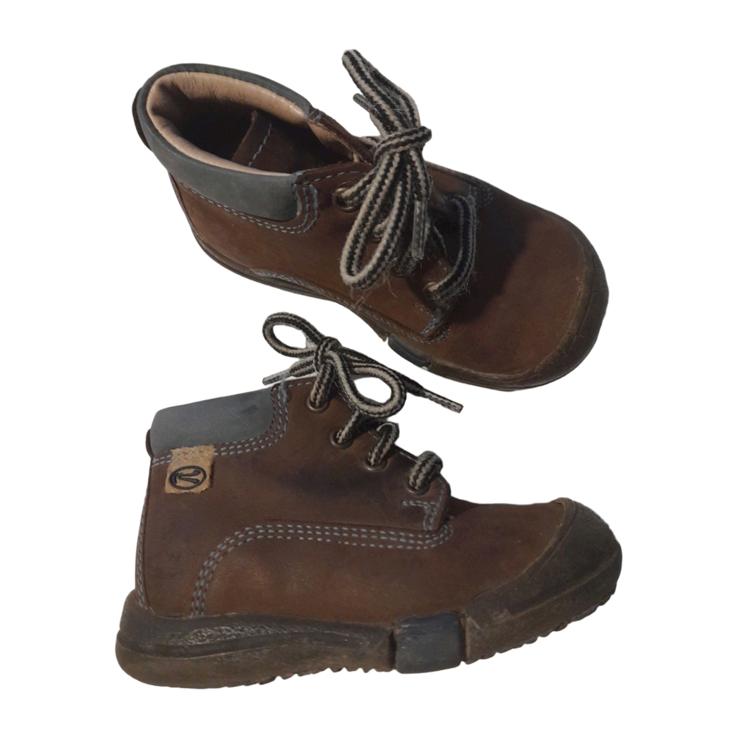 Ruskeat nahkakengät koko 20. Kengän kärjestä kumi halkeillut ja irti nahkapinnasta.