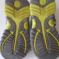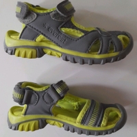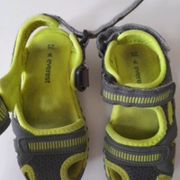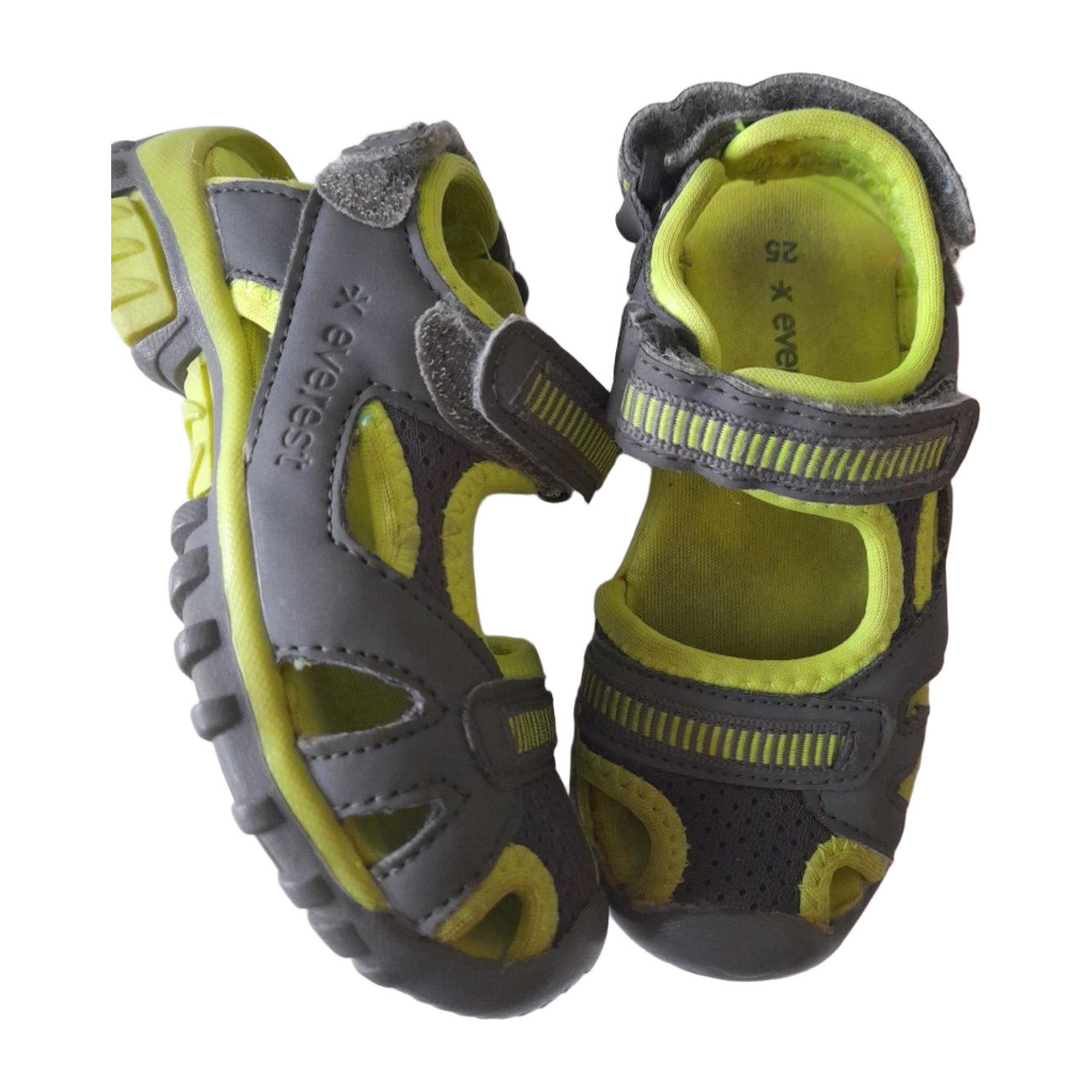 Everest lasten remmisandaalit / urheilusandaalit. Koko 25. Harmaa / neonkeltainen. Sandaalien neonkeltainen sisäpuoli on likaantunut / tummunut. Voisi paremmin pesemällä lähteä puhtaammaksi, nyt ovat vain kevyen vadissa huuhtelun jäljiltä.
