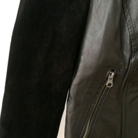 Aitonahkainen musta takki, käytetty vain vähän. Hihat mokkanahkaa. Pientä nukkaantumista resoreissa, muuten kiitettävä kunto.