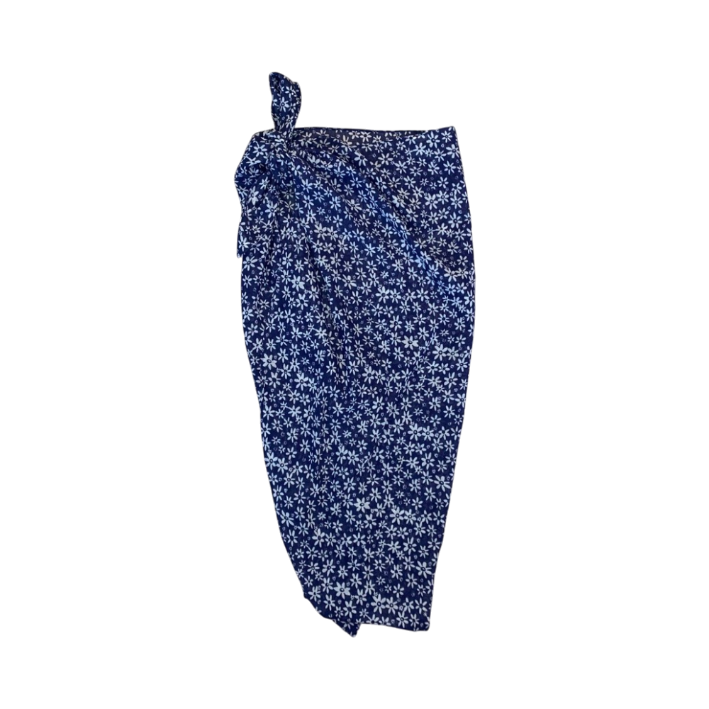 Sininen kukkakuvioinen kietaisuhame. Voi sitoa monella eri tavalla. Sopii ainakin S-kokoiselle hyvin.