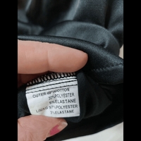 Polyesteri, Puuvilla, Satiini, Joustava, Vetoketju takana, Elastaani. Miehustassa pieniä höyheniä.