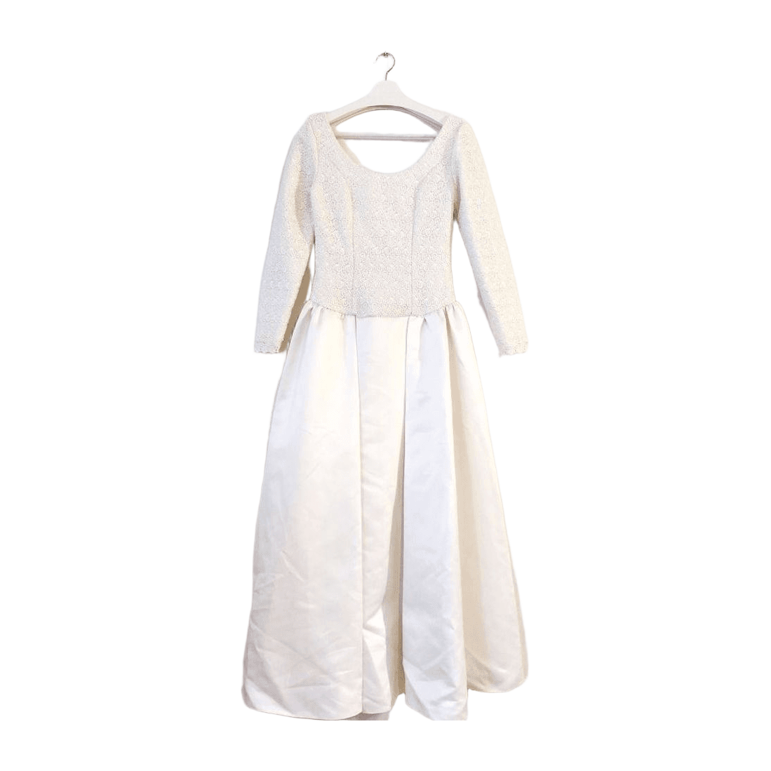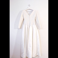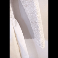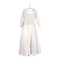 Kerran käytetty, pesulapesty hääpuku, joka käsintehty Burda Couture kaavojen mukaan, koko 34. Hameosassa vuori.. Pakettiin kuuluu alushame, jossa röyhelöhelma ja hameosaa kohottava vanne. Alushame muokattavissa omien mittojen mukaan kuminauhavyötäröstä. Materiaali paksua satiinia sekä pitsiä. Puvun väri on off-white tai munankuoren värinen, ei lämmin eikä kylmän valkoinen. Suositellaan puhdistusta pesulassa, jossa kangas voidaan höyryttää suoraksi säilytyksen jälkiltä. Koko arvio Xs tai S
