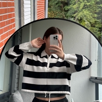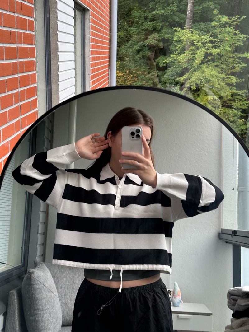Cropped black-and-white striped knit polo sweater, relaxed fit. Very nice to the skin, barely worn