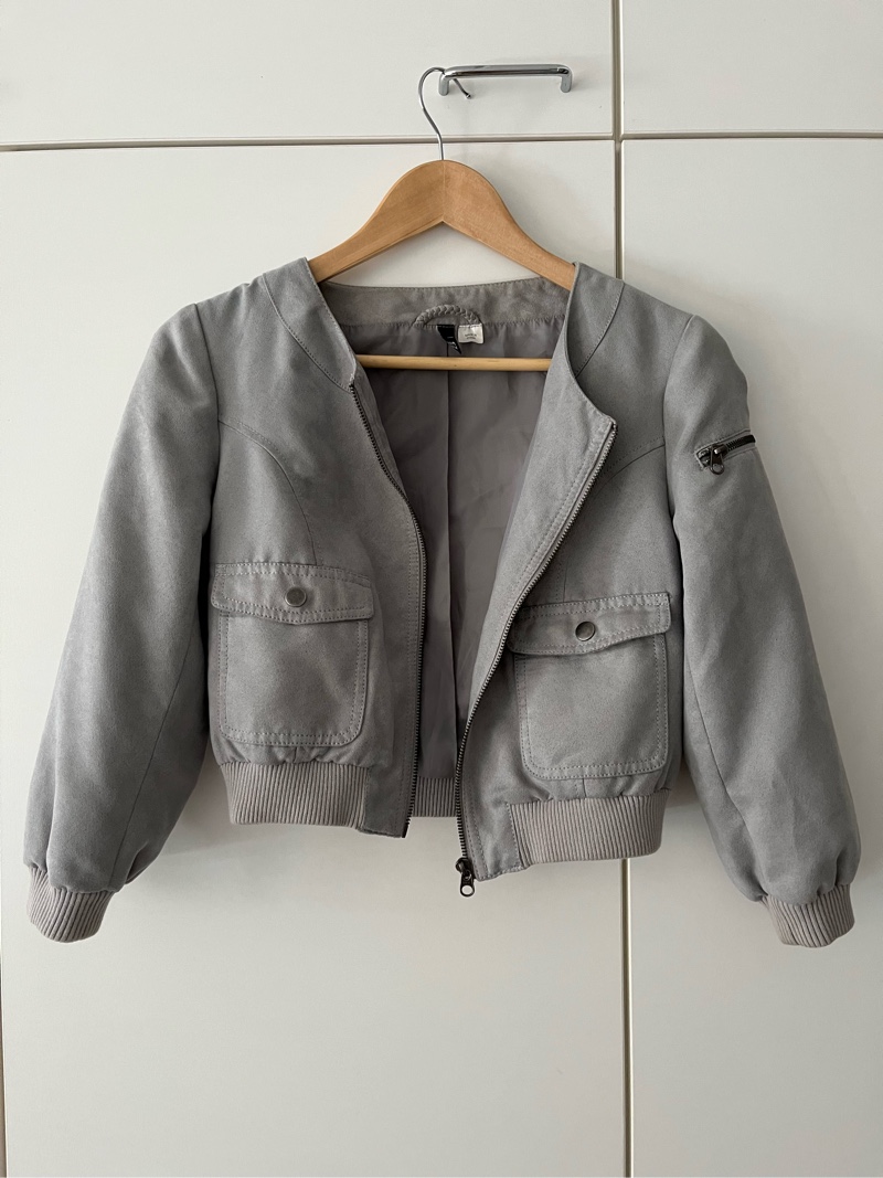 Kropattu harmaa bombertakki. Pinta mokkanahan tyyppinen. Edessä, hihassa ja takin sisällä taskut. Siistissä kunnossa. Istuu mielestäni XS-M kokoiselle