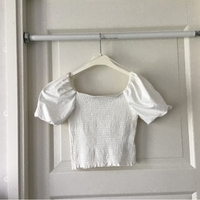 Valkoinen pusero, jossa muhkeat pussihihat. Lyhyt malli. Joustava ympärys.