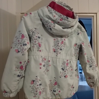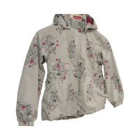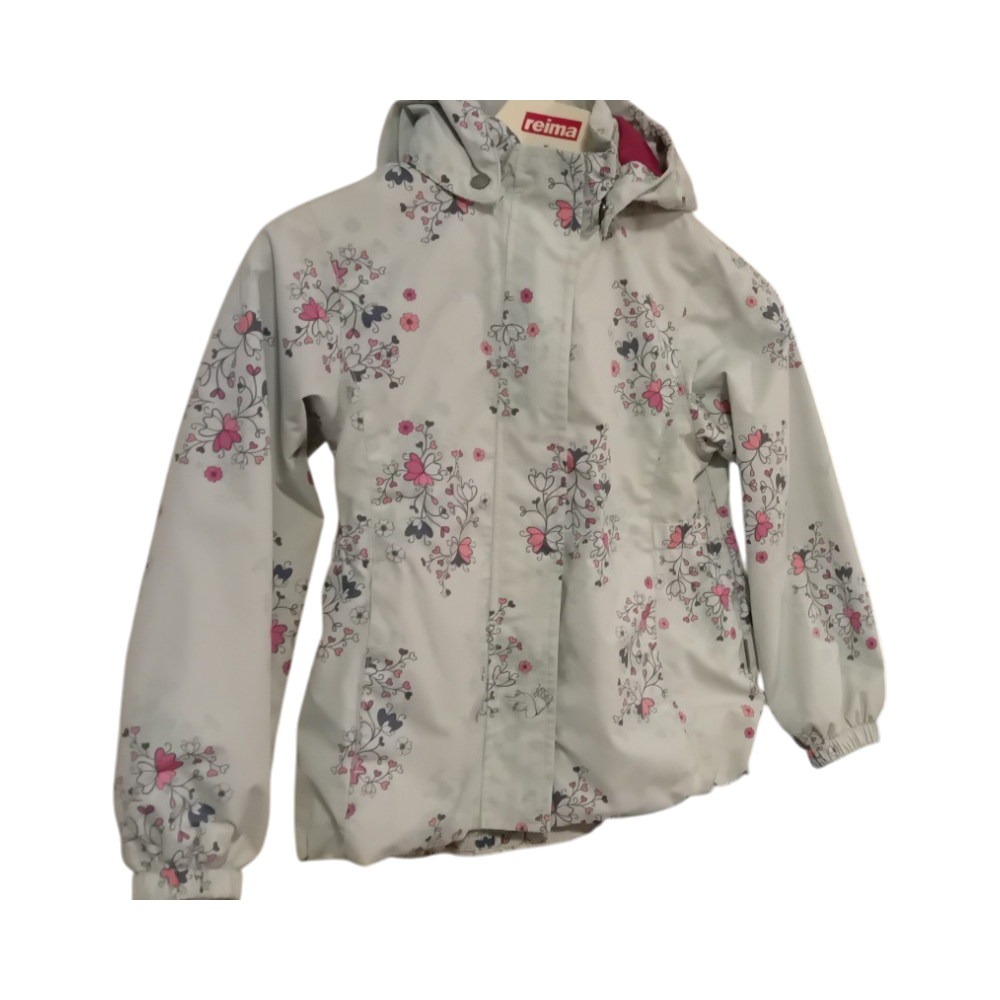 Lassien hyväkuntoinen harmahtava kukkakuvioinen verkkovuorattu tuulitakki. Vetskari+tarra, irrotettava muotoiltu huppu, muotoilukuminauha vyötärössä. Koko reilu 116cm. Moitteeton kunto.
