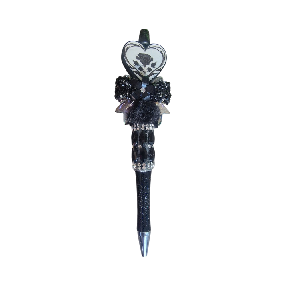 Koristeellinen musta kuulakärkikynä strasseilla ja karvatupsulla.