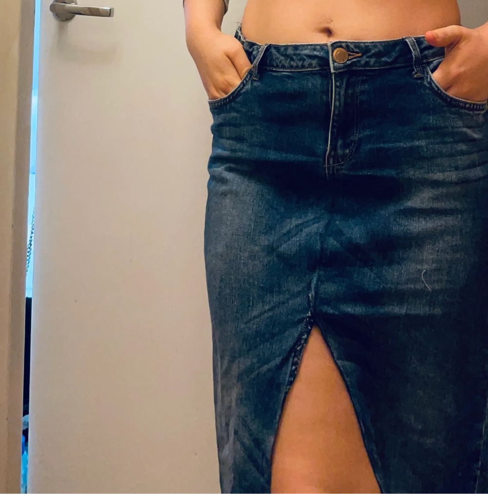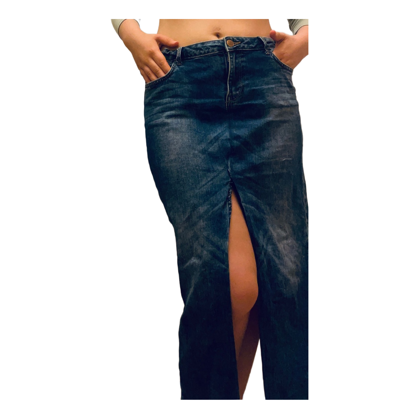Pitkä/midi mittainen farkkuhame. Ommeltu itse capreista. Joustaa. Takana normaalit farkun taskut. Noin M/L kokoa