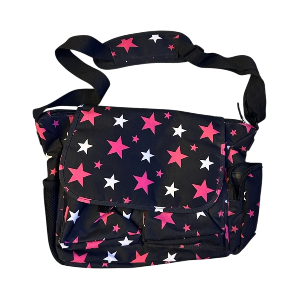 Musta olkalaukku vaaleanpuna-valkoisilla tähdillä, useita taskuja.
