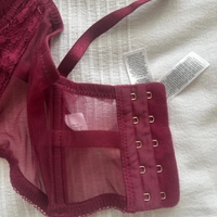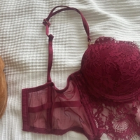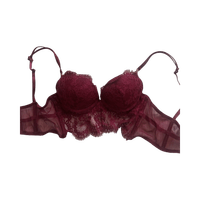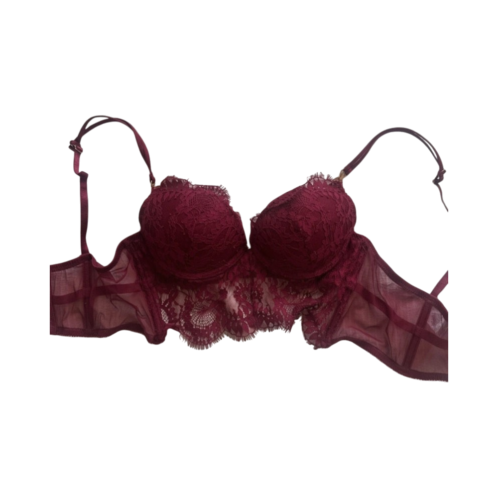 Burgundy lace balconette bra with mesh sides and hook back. Size 75A.