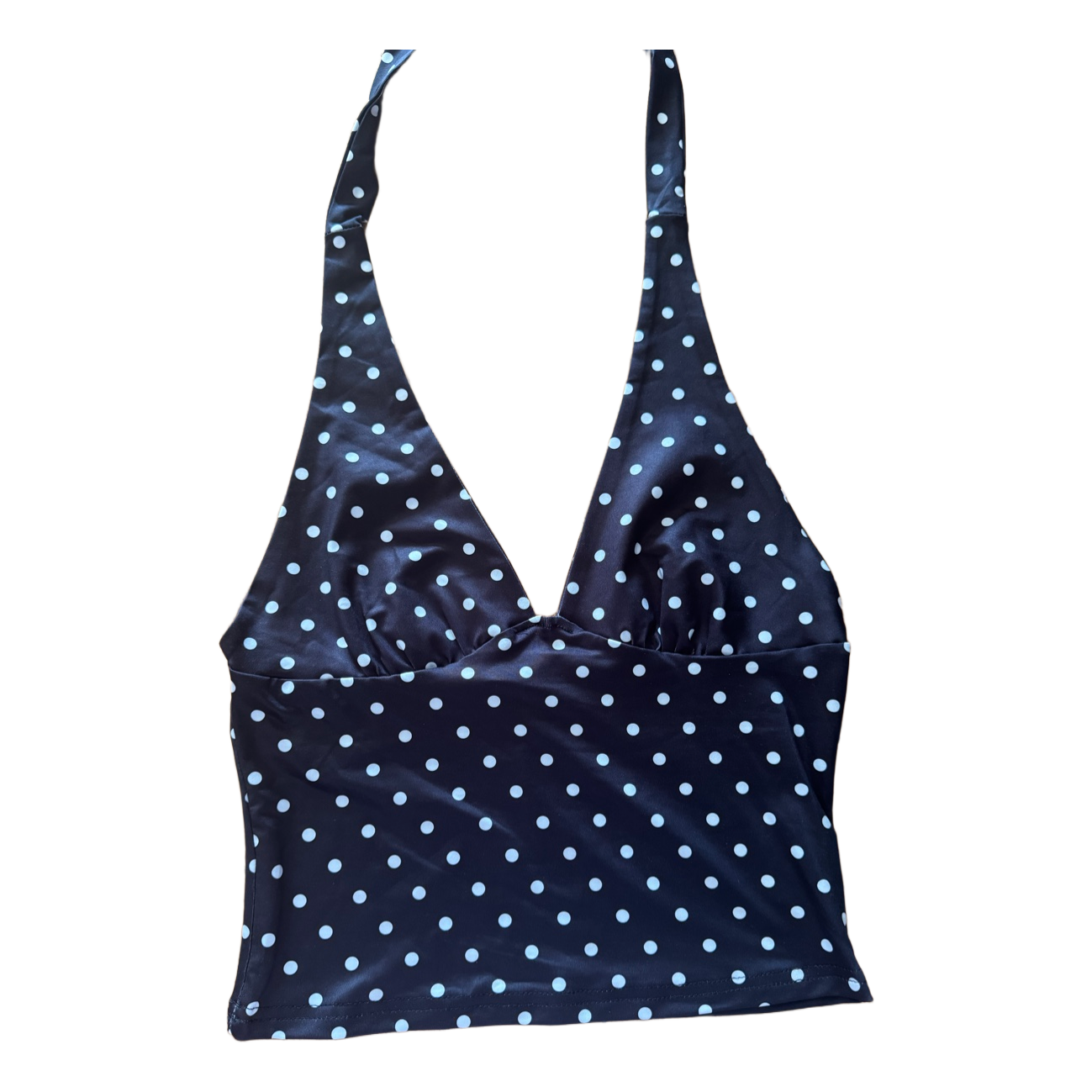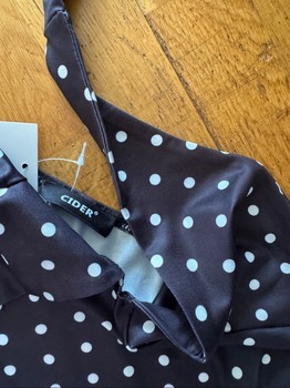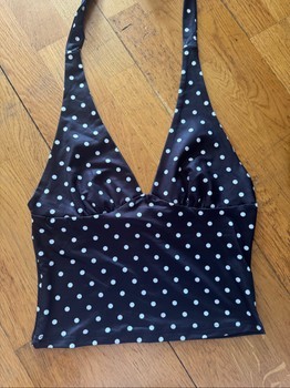 Musta pilkkukuvioinen halter-top. Uusi, hintalappu kiinni.