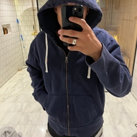 Tummansininen vetoketjullinen huppari, pieni logo rinnassa.