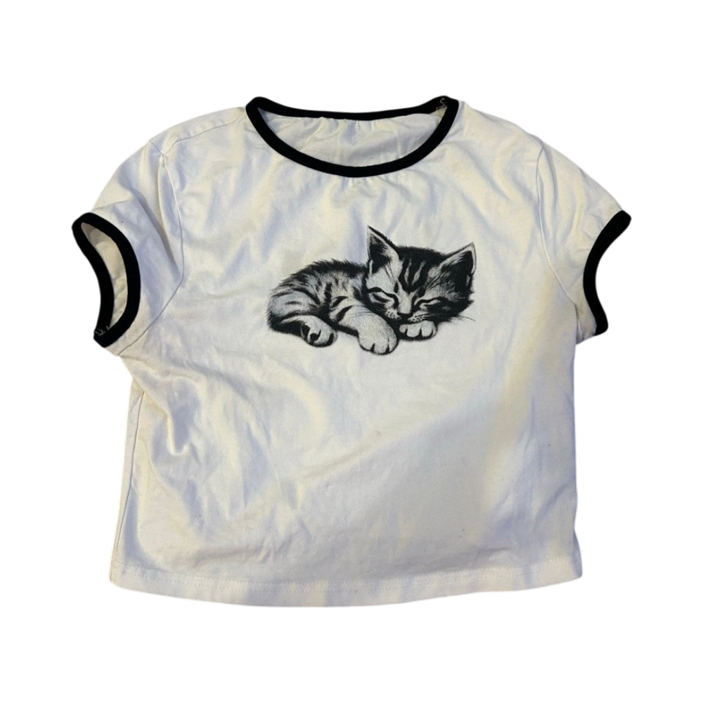 Lyhythihainen valkoinen ringer-t-paita kissaprintillä.