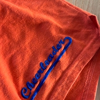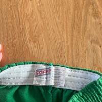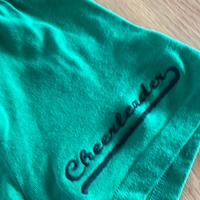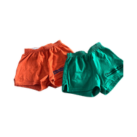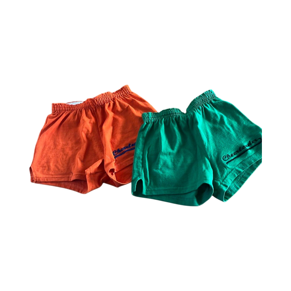 Oranssi ja vihreä shortsit, kirjailtu teksti, käytetty kunnossa, mustetahra.