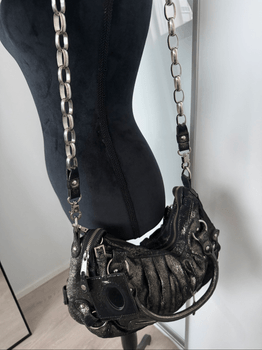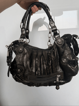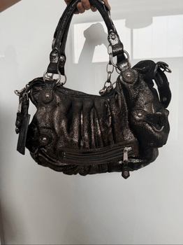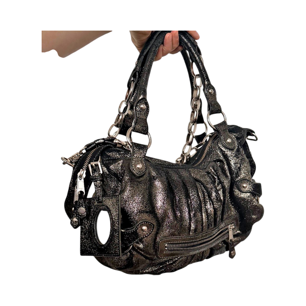 Birger by Marlene , Grey metallic shoulder bag with silver-tone hardware. It features a ruched design, multiple zipper pockets, and chain details on the handles. A small mirror charm is attached.