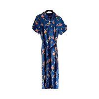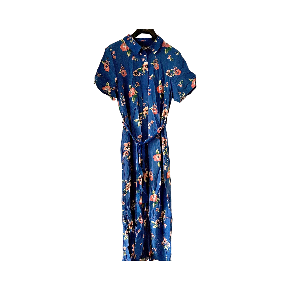 Sininen kukkamekko, jossa vaaleanpunainen kukkakuosi ja vyö.