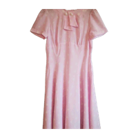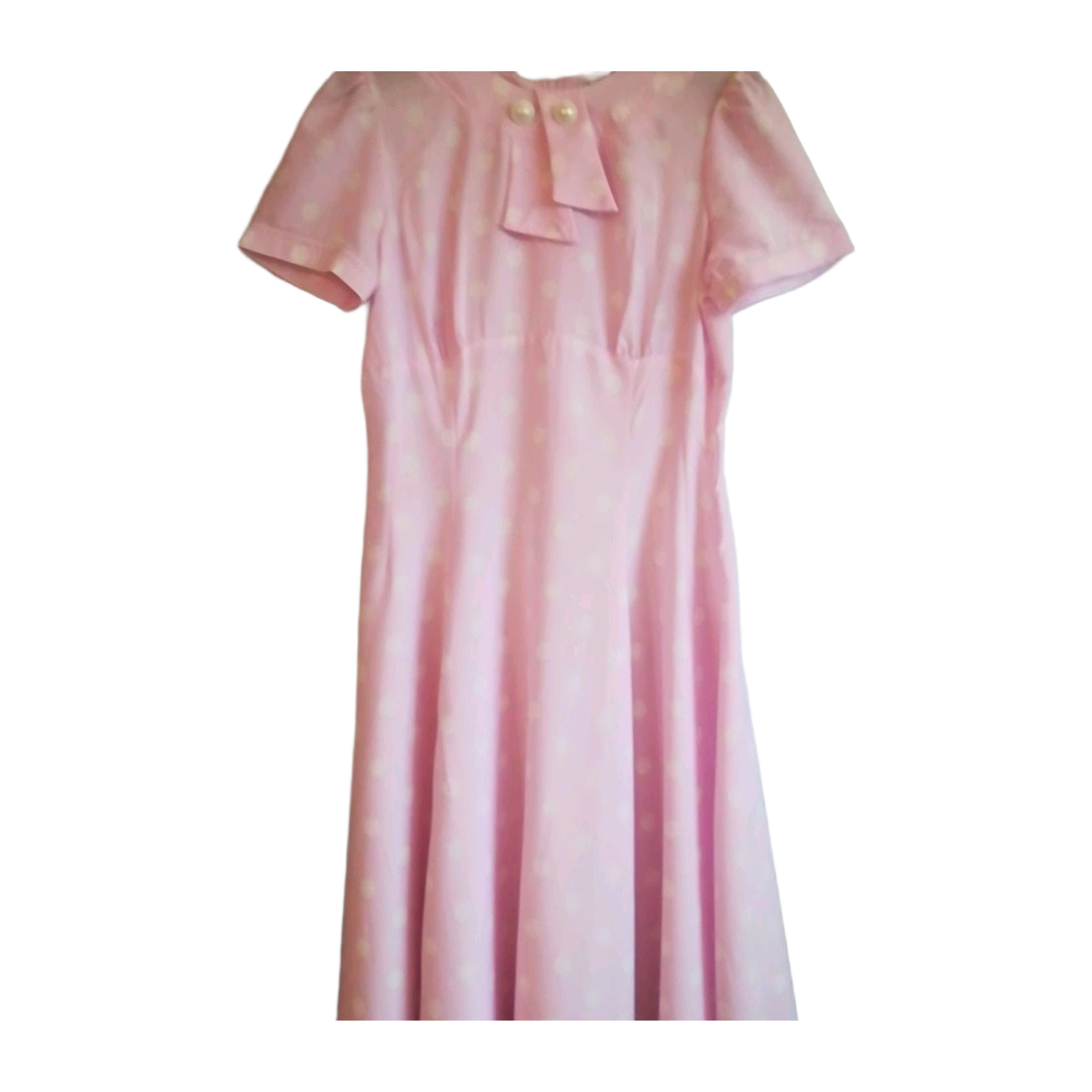 Ihana vintage tyylinen mekko. Ohuehkoa kangasta (läpikuultavaa) Vetoketju takana, helmikoristeet kaula-aukossa. Vastaa mielestäni ennemmin kokoa M/38. Hempeän vaaleanpunainen valkoisilla pilkuilla. Kauniisti laskeutuvaa kangasta. Kainalo kainalo mitta 45 cm, pituus olasta helmaan 110. Ei jousta. Ilmainen toimitus HE7274.