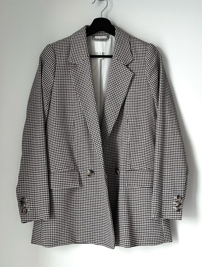 Valko-musta/ruskea houndstooth-bleiseri, oversize-leikkaus. Koko XS