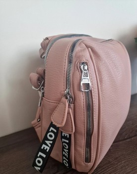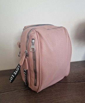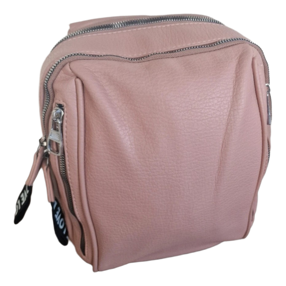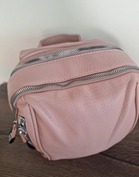 Pink backpack made of faux leather. Features multiple zippered compartments .