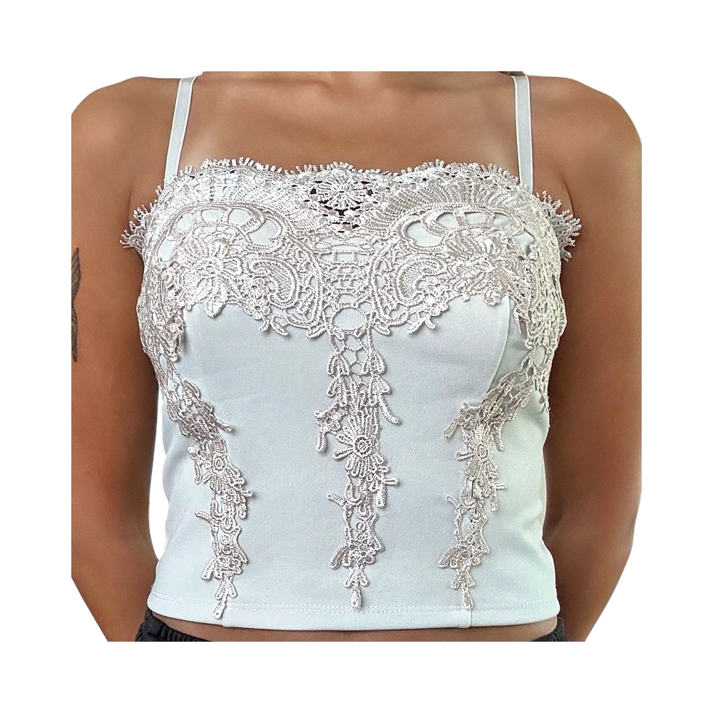 Stunning white crop top with beige lace details in the front. Size XS/S, stretchy fabric. Perfect for parties, evening looks or summer outfits. Eye-catching yet elegant top that pairs beautifully with jeans, skirts or trousers. Excellent condition.