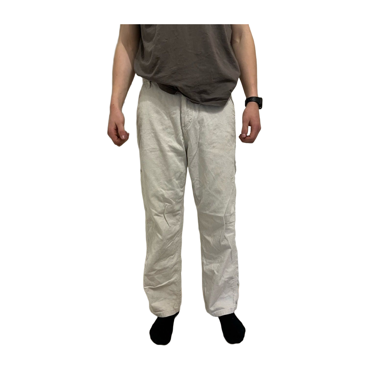 Hyvässä kunnossa olevat vakosamettiset housut, pieni haalea tahta toisessa lahkeessa