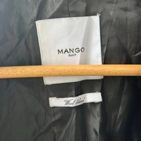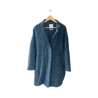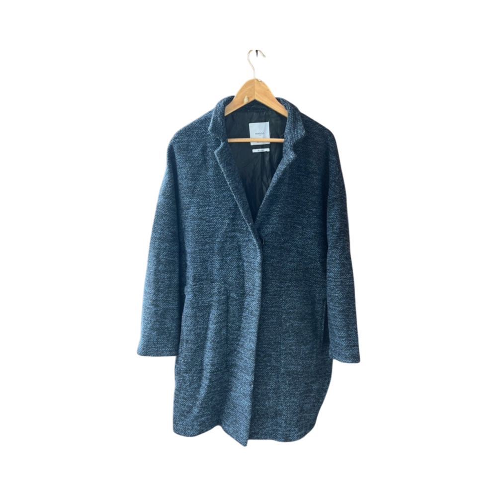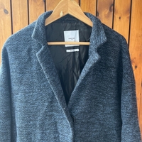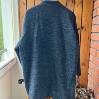 Pari kertaa käytetty, erittäin hyvässä kunnossa. M koko, vastaa kokoaan. Rento, suora malli. Lyhyt kaulus. Pituus olkasaumasta mitattuna 88 cm. Värinä sininen ja musta (boucle-kangas). Kissatalous.