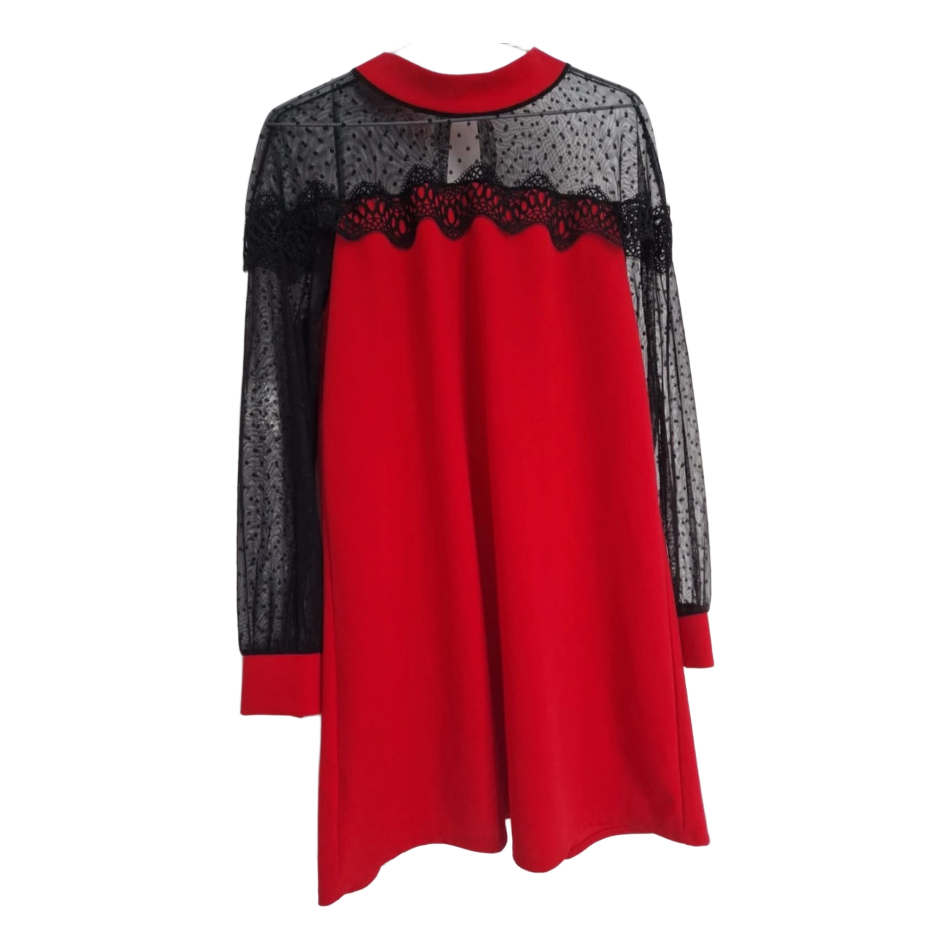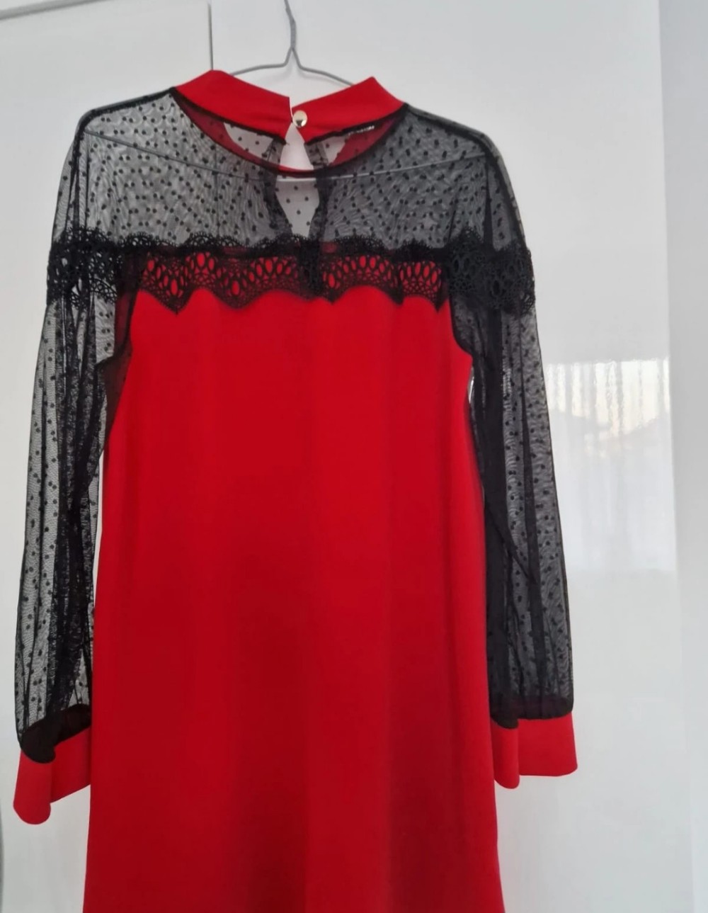 Red dress with long black mesh sleeves featuring polka dot pattern and lace details. High neckline with back button closure.