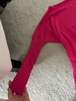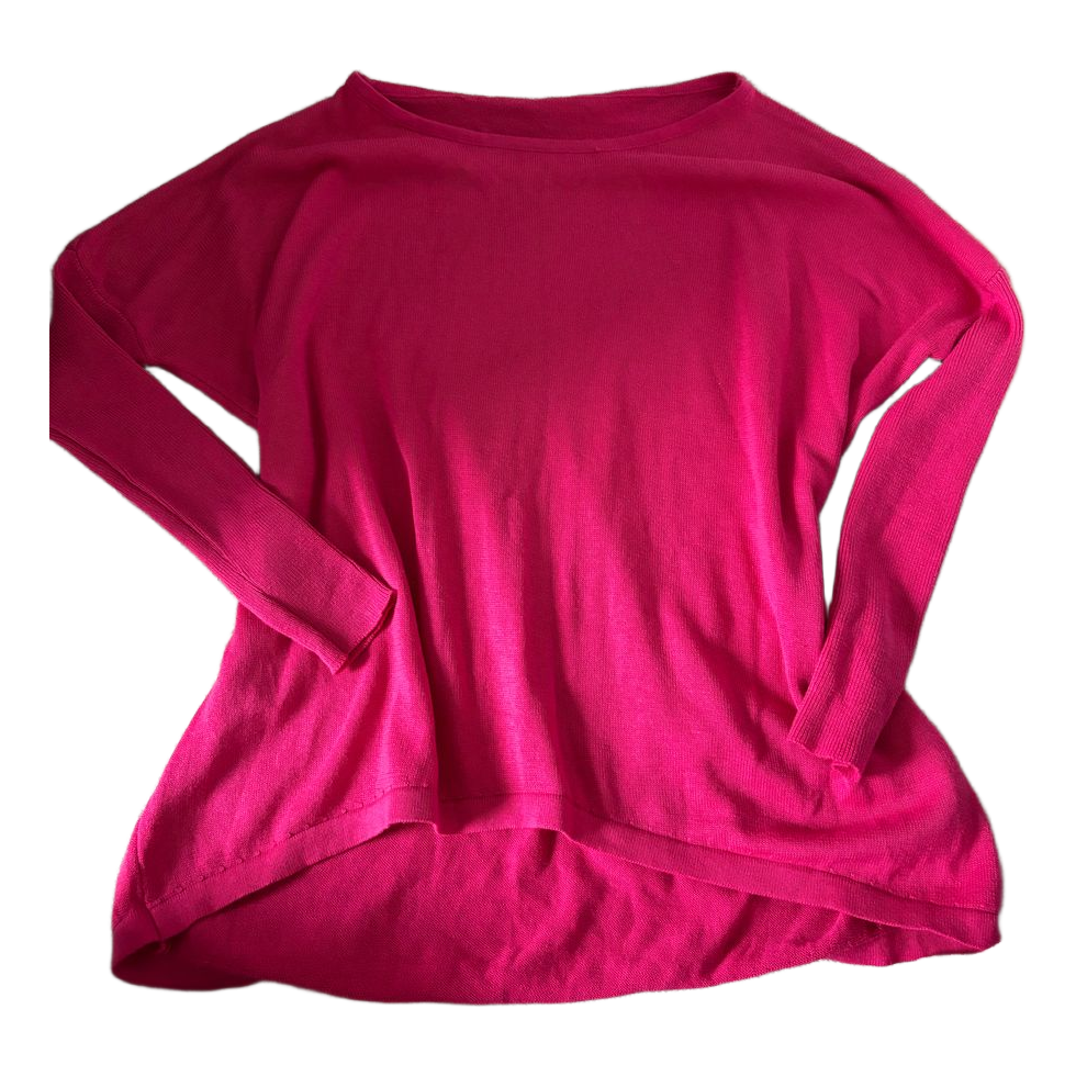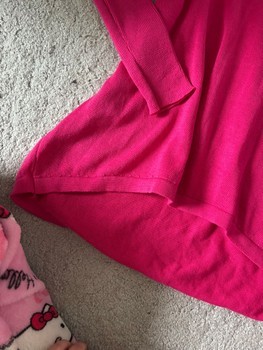 Pinkki pitkähihainen neulepaita. Pyöreä kaula-aukko ja helma takaa pidempi. Hihat on tiukemmat