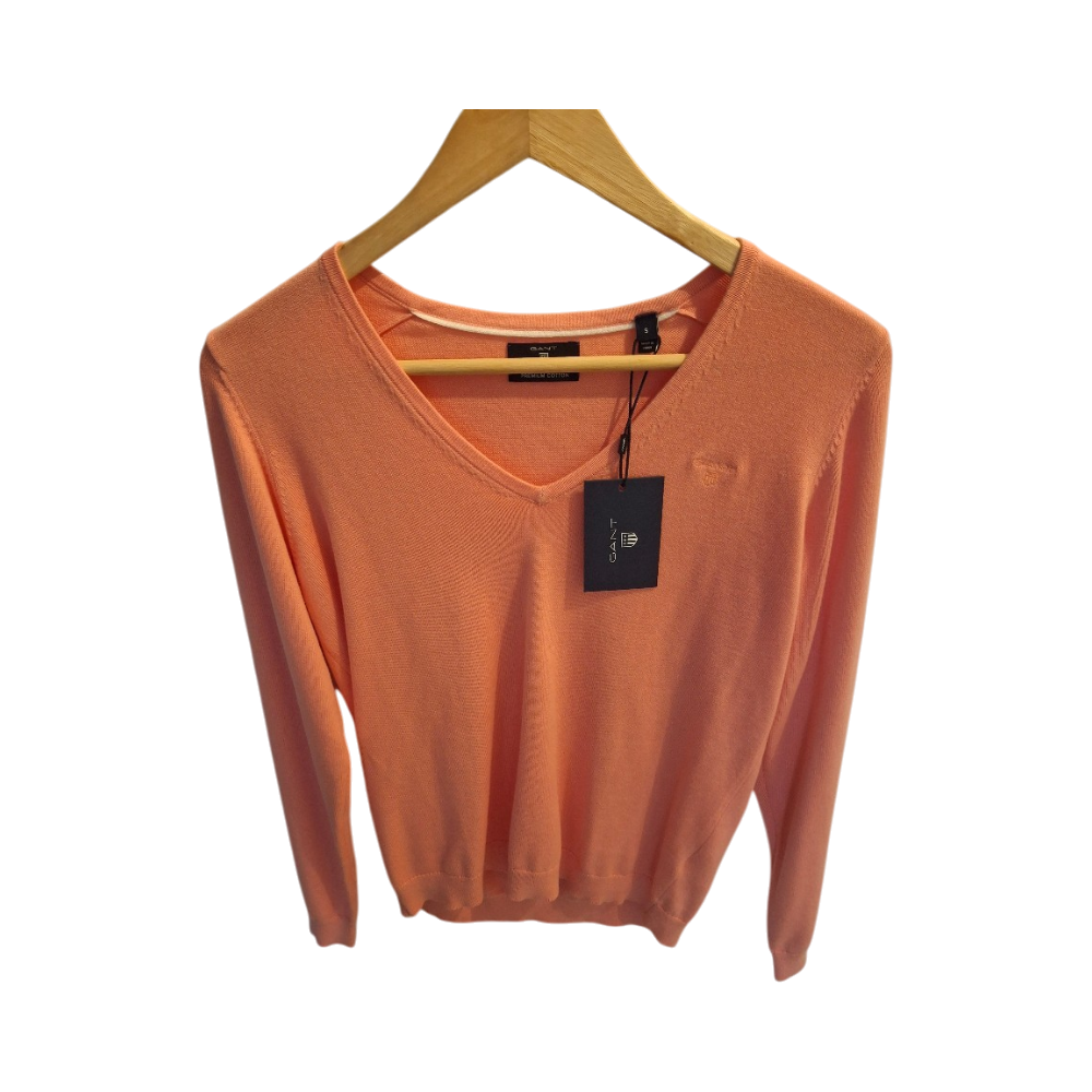 V-kaula-aukko, suora malli. Edessä painettuna Gant. Perus neule.