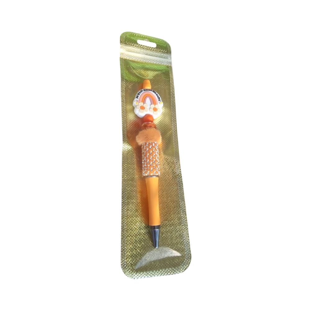 Koristeellinen oranssi kuulakärkikynä, strasseilla ja tupsulla.