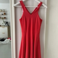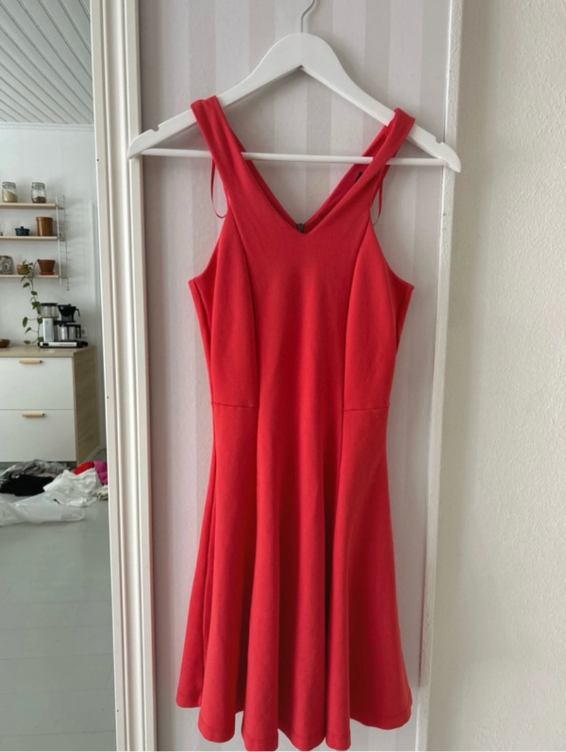 Red sleeveless dress with v-neck and back zipper closure.
