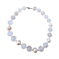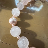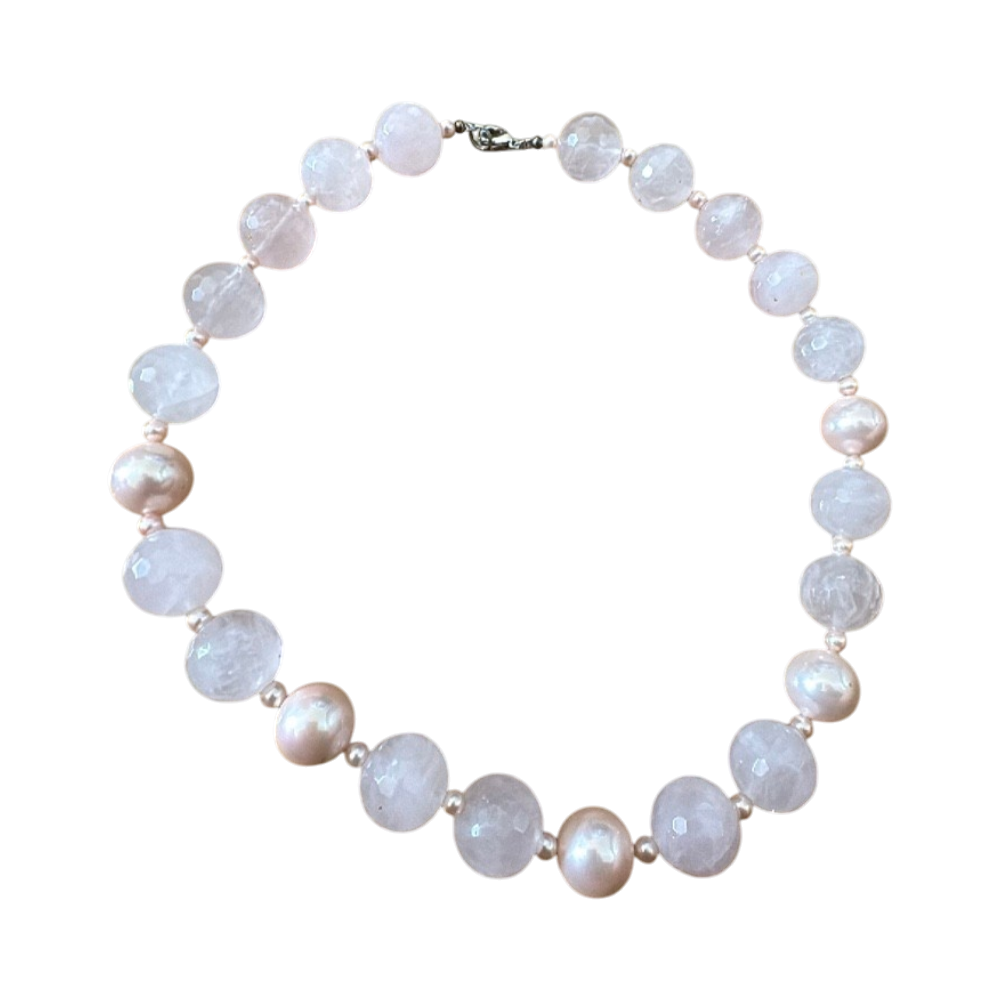 Faceted rose quartz beads with pink beads (material unknown), lobster clasp. Feels cold and heavy to the touch.