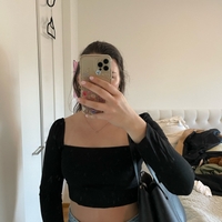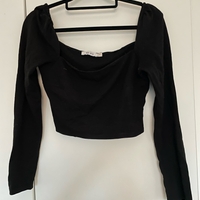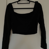 Yksinkertainen ja imarteleva musta crop top pitkällä hihalla. Leveä pääntie, kevyet puff-olkakohdat ja tiukka istuvuus. Monikäyttöinen – sopii farkkujen tai hameen kanssa iltamenoihin tai kerrospukeutumiseen.