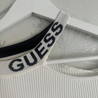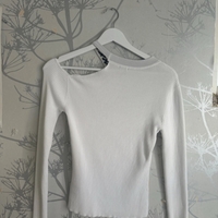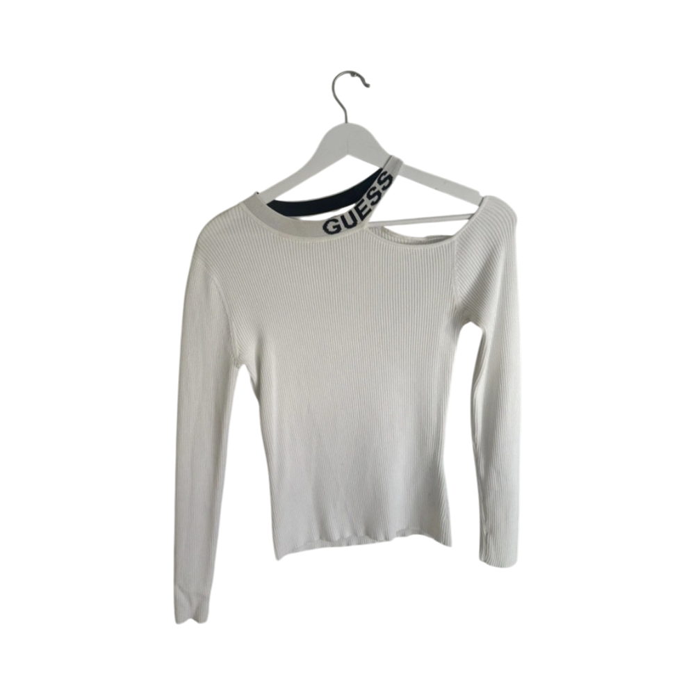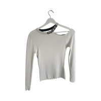 White ribbed long-sleeve top with asymmetric shoulder strap.