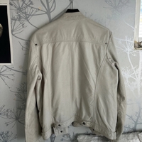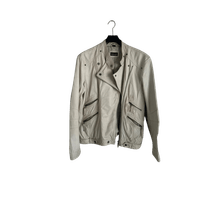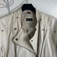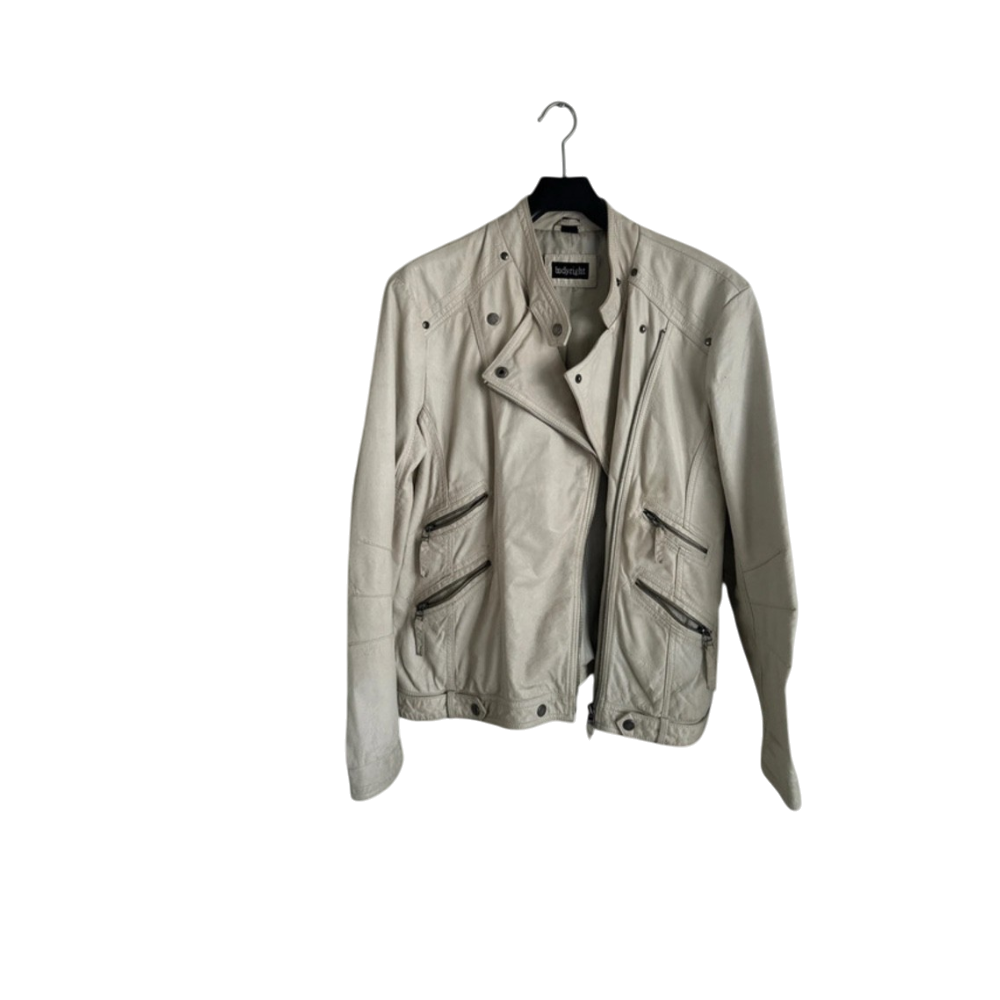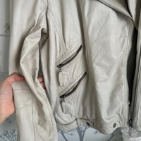 Lightweight beige leather biker jacket with zip pockets and studs.