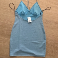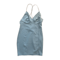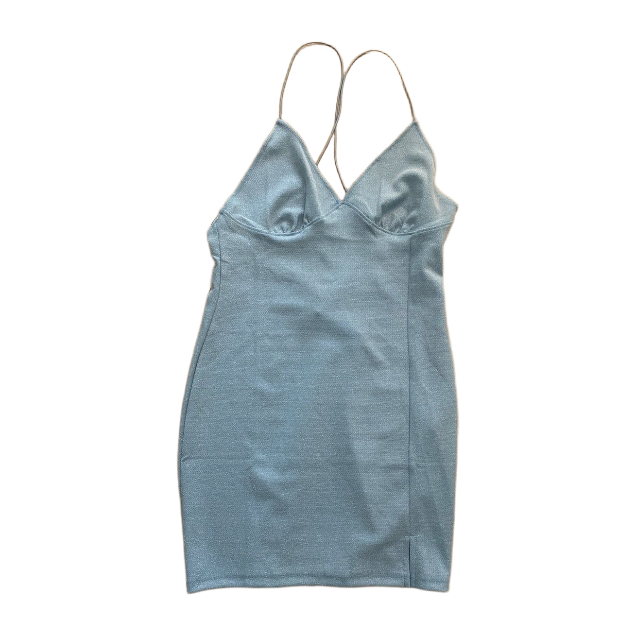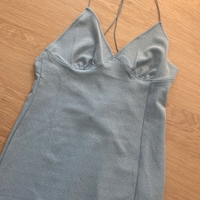 Vaaleansininen kimaltava mekko jossa olkaimet menee ristiin.