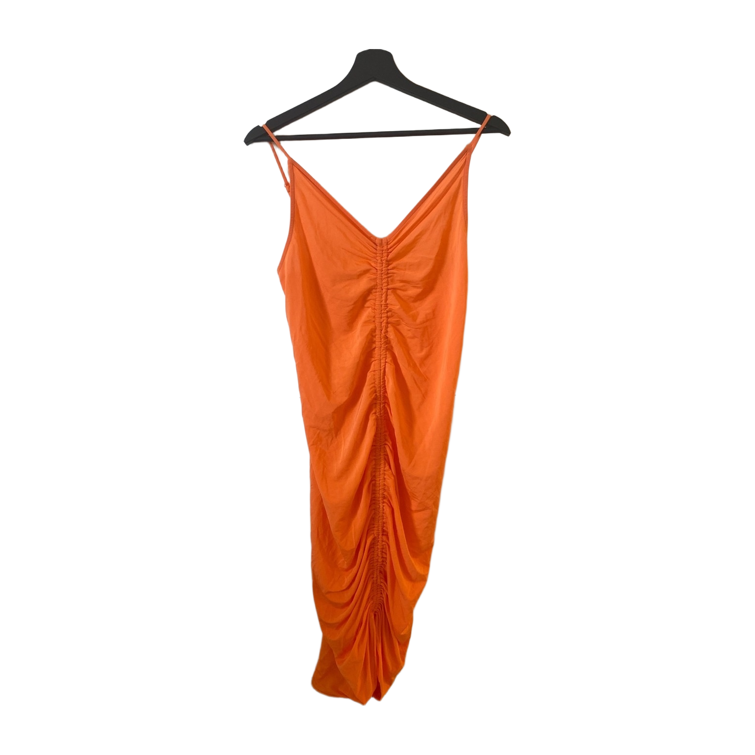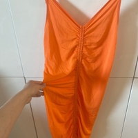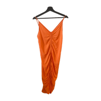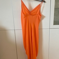 Oranssi joustavaa kangasta oleva mekko. Säädettävät olkaimet, säädettävä rypytys. Kokolappu leikattu, sopii M/L kokoiselle. Pituus 170cm yli polven pisimmillään.