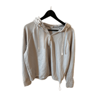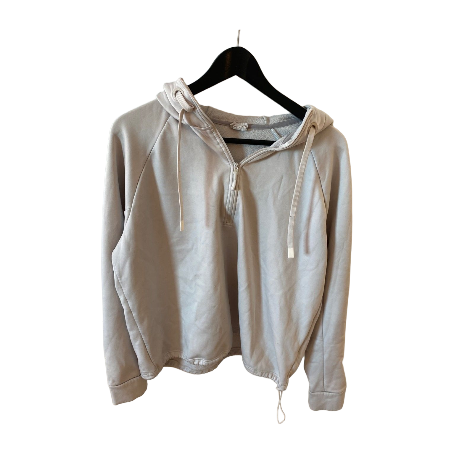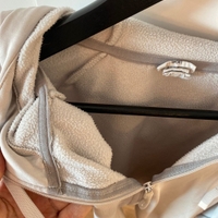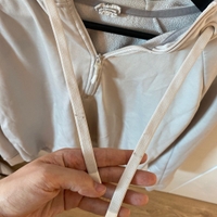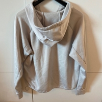 Vaalean harmaa huppari jossa vyötäröllä kiristysmahdollisuus. Sisäosan karva erottunut ja nauhoissa pienet tahrat.