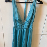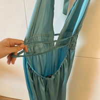 Turkoosi pitkä mekko. Avonainen edestä ja selästä. Niskan takaa sidottava nauha. Koko pieni L. Käytetty vain yksien kuvausten ajan.
