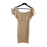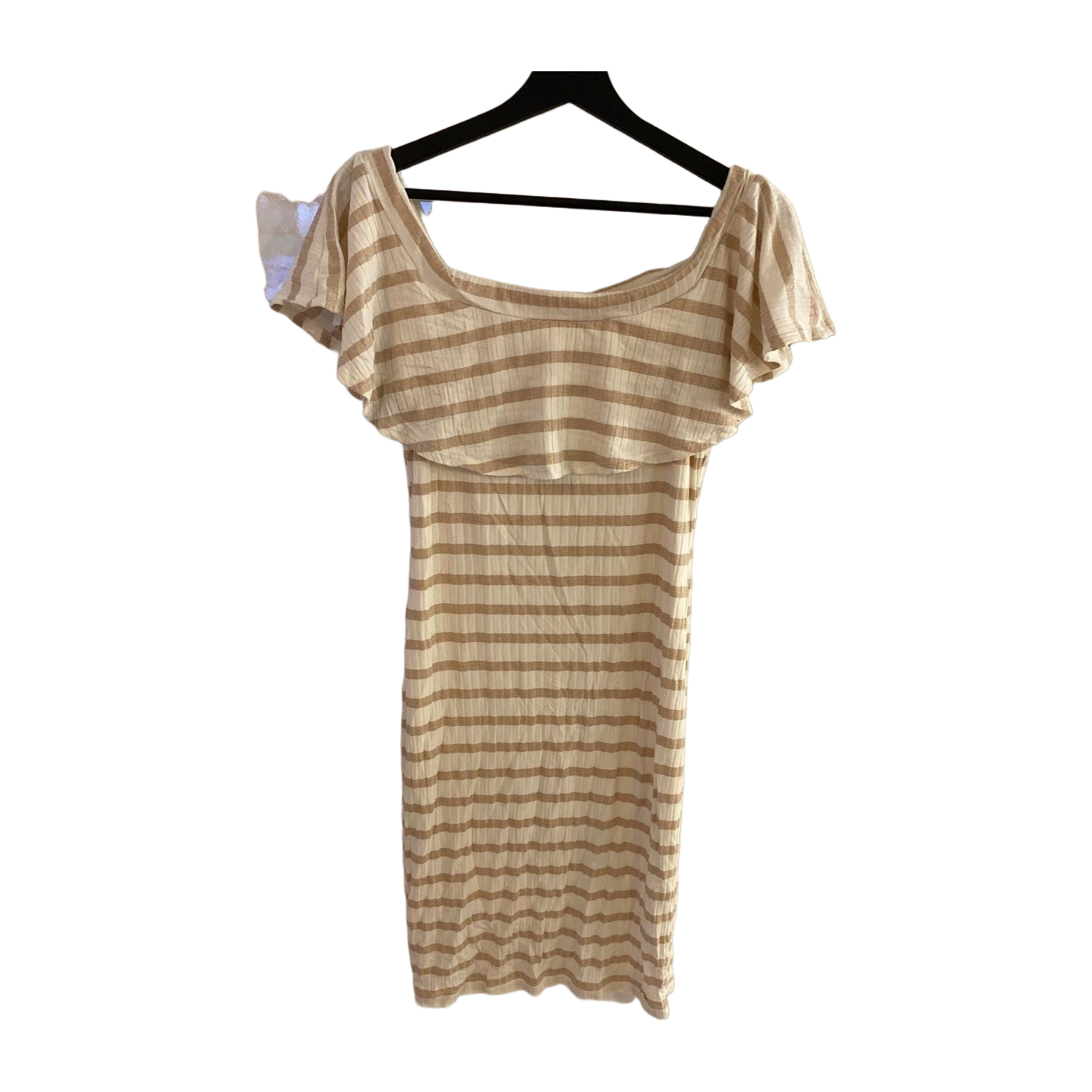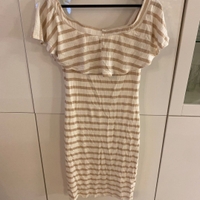 Valko-kultaraidallinen offshoulder mekko. Koko M. Alla alushame kiinni eli ei näy läpi.