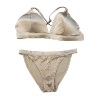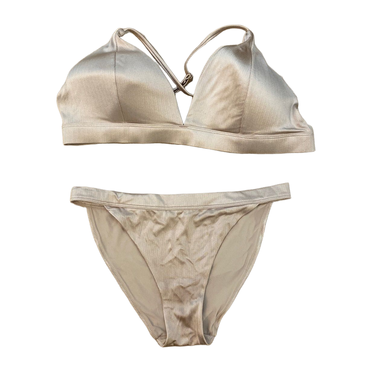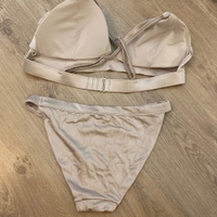 Vaalean beiget metallinhohtoiset bikinit. Kokolaput leikattu pois mutta yläosa paras C/D kupilla (tod näk koko 44) ja alaosa M/L (tod näk koko 42). Kerran käytetty. Alaosassa pieni rispaantuma (ks. kuva). Huom! Kaikki 5e tuotteet; osta 2 ja saat kolmannen kaupan päälle!
