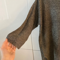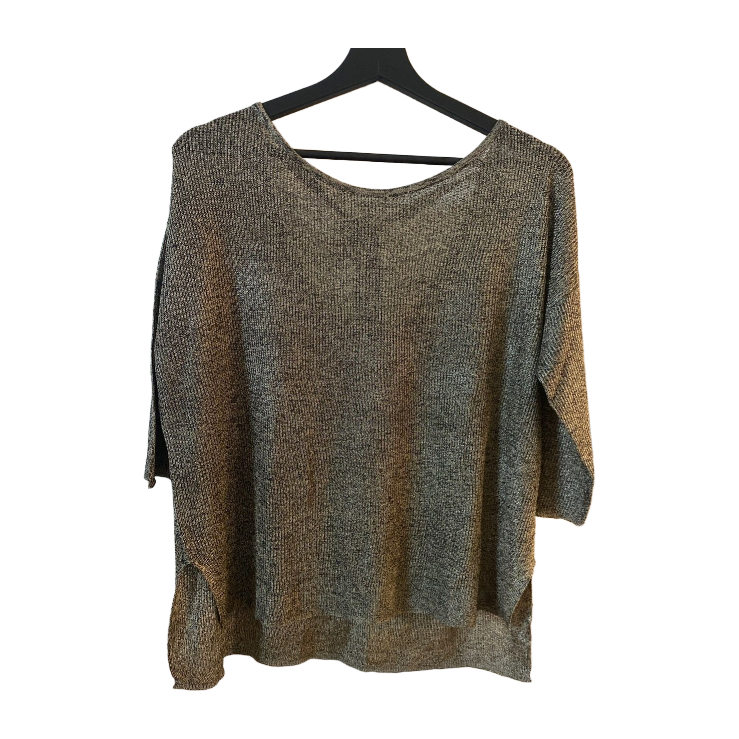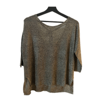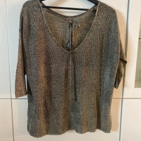 Vihreä hieman kimaltava löysä paita. Helmassa halkiot, 3/4-hihat, takana sidottava naru ja avonainen selkäaukko. Koko M, sopii myös L. Muutama pieni langannousu, yleisilme siisti.