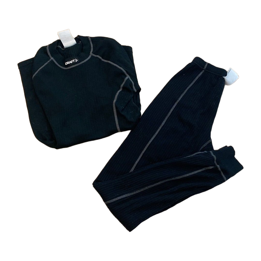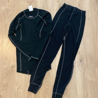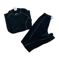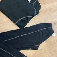 Aluspukusetti, pitkähihainen ja pitkät housut. Molemmat kokoa S. Reilusti pesunukkaa, vaatii siistimistä nukapoistokoneella. Huomioi myös paidan niskassa sauma.
