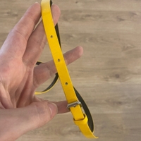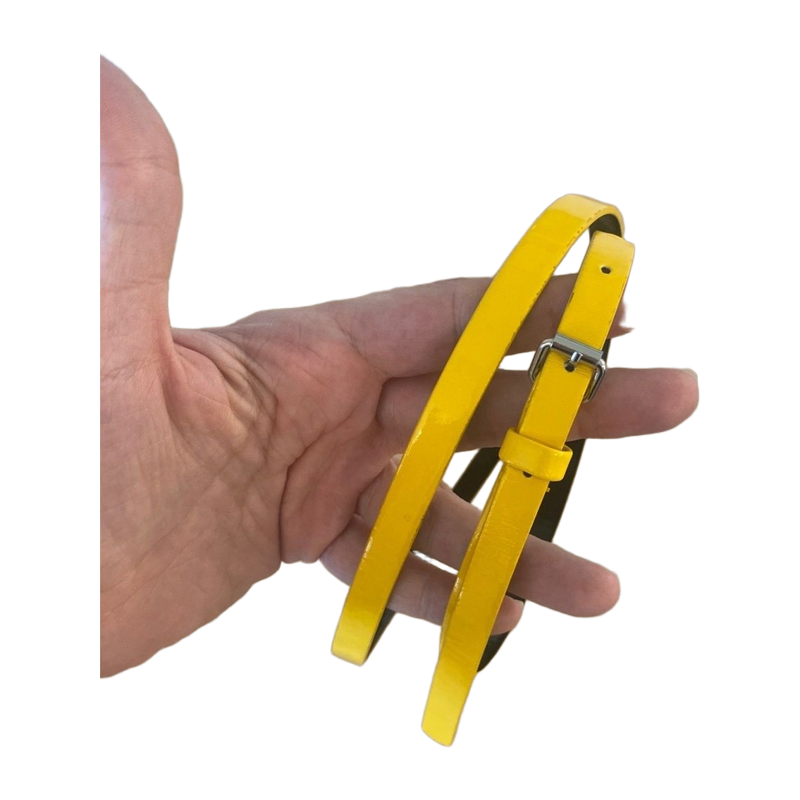 Keltainen ohut tekonahkavyö. Koko M, sopii noin 75-80cm vyötärölle.