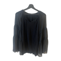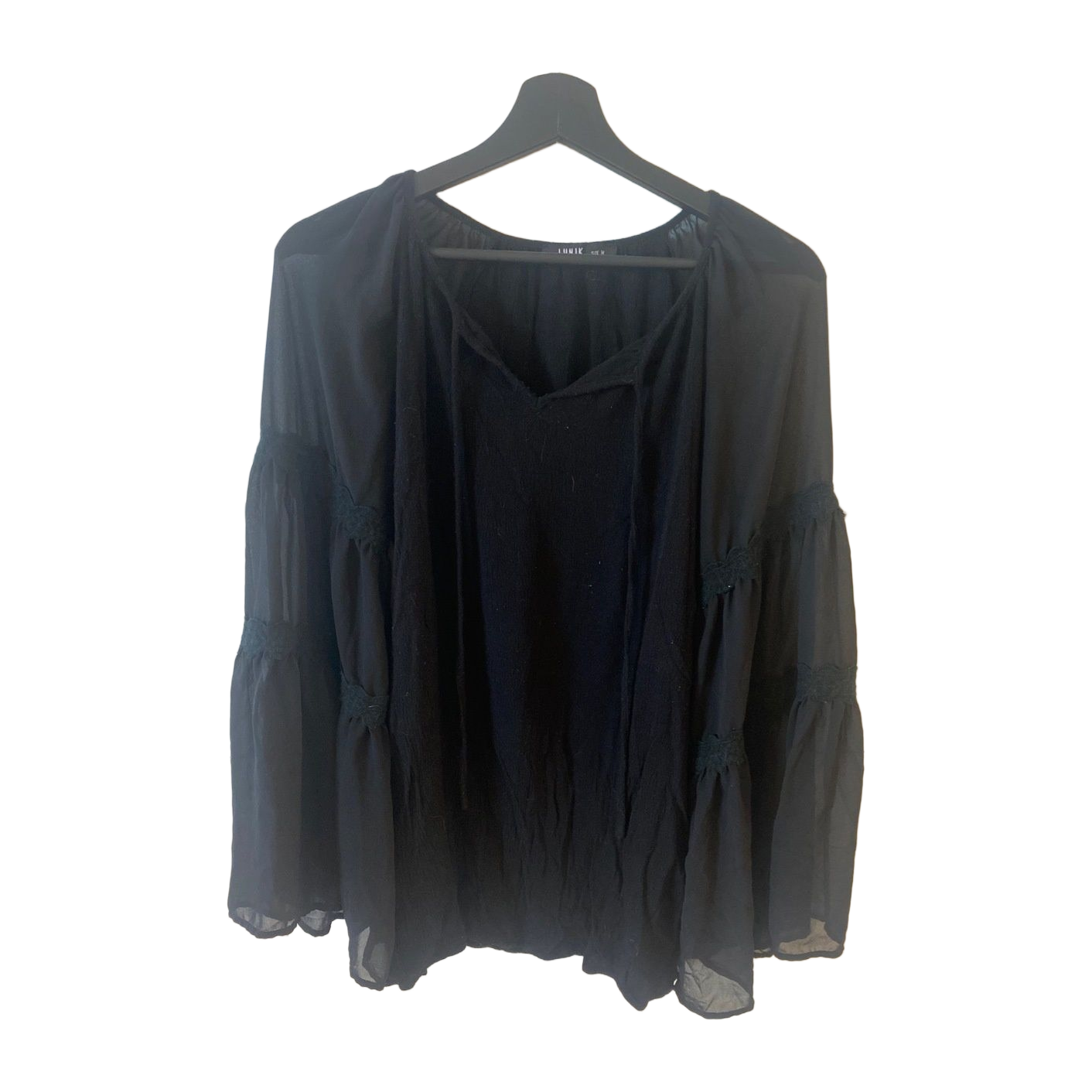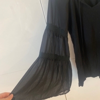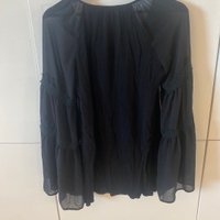 Musta pitkähihainen jossa levenevät läpikuultavat hihat ja pitsiset yksityiskohdat. Koko M.