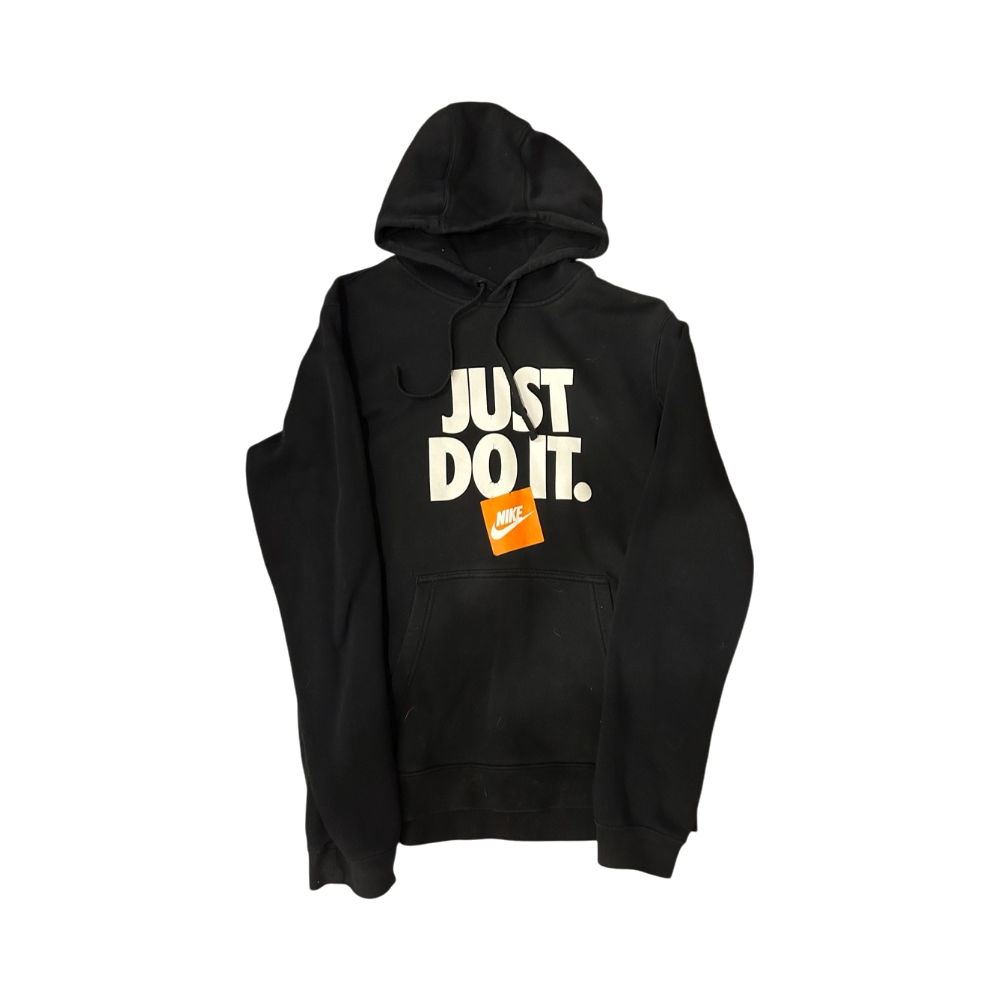 Mustahuppari valkoisella 'Just Do It.' -tekstillä, etutasku.